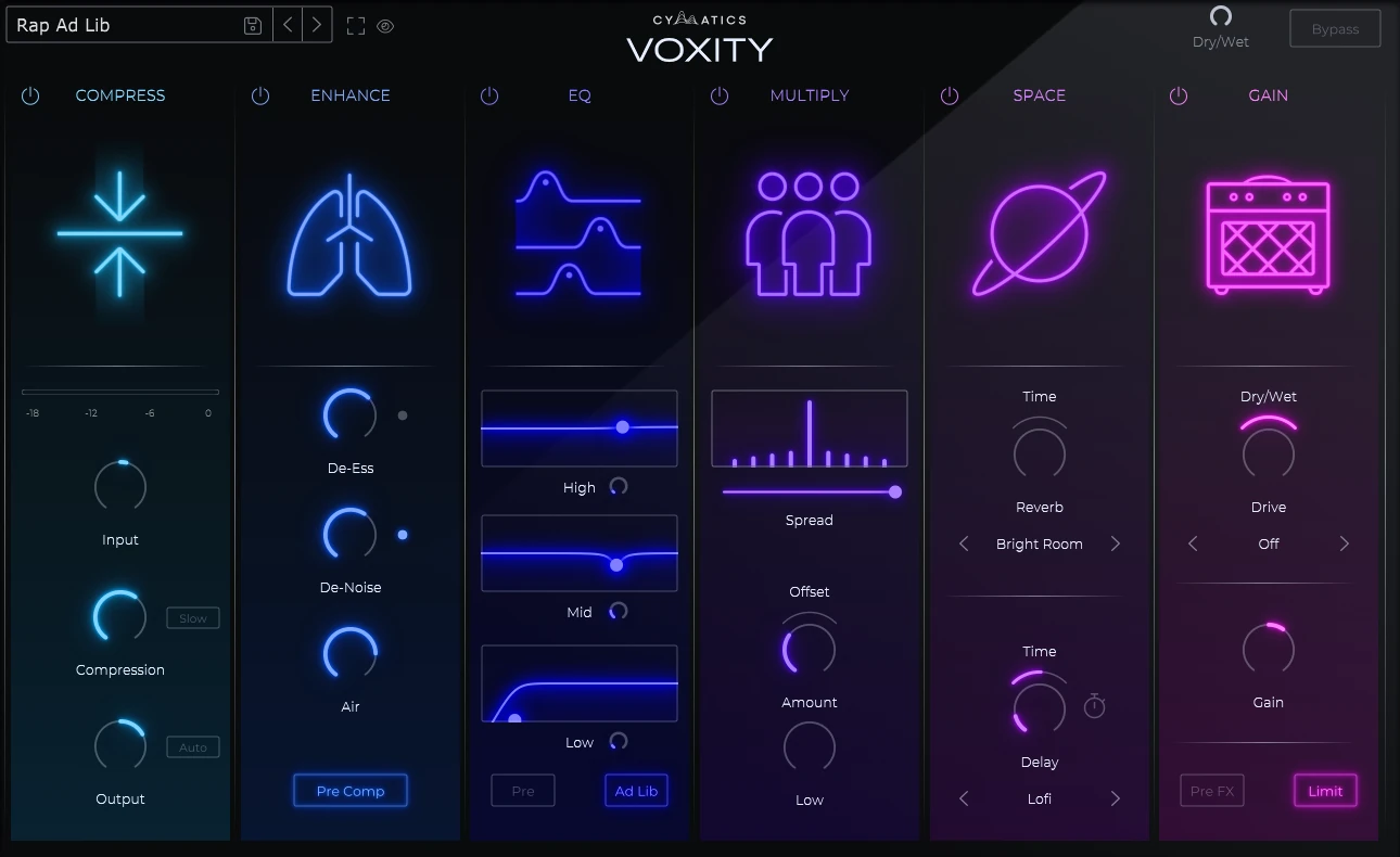 Na prática, o plugin oferece controles acessíveis para modelar dinâmica (compress), limpar e “abrir” a região aguda da voz (enhance), ajustar graves, médios e agudos com um EQ simplificado, além de ferramentas de widen/multiply que criam ambiência e camadas. Há também uma seção de espaço com reverb e delay para posicionar a voz no mix e um estágio final de ganho/saturação para dar cor e presença. A ideia é transmitir clareza e punch sem exigir conhecimento técnico profundo — o usuário escolhe um preset e ajusta poucos parâmetros até chegar ao som desejado.