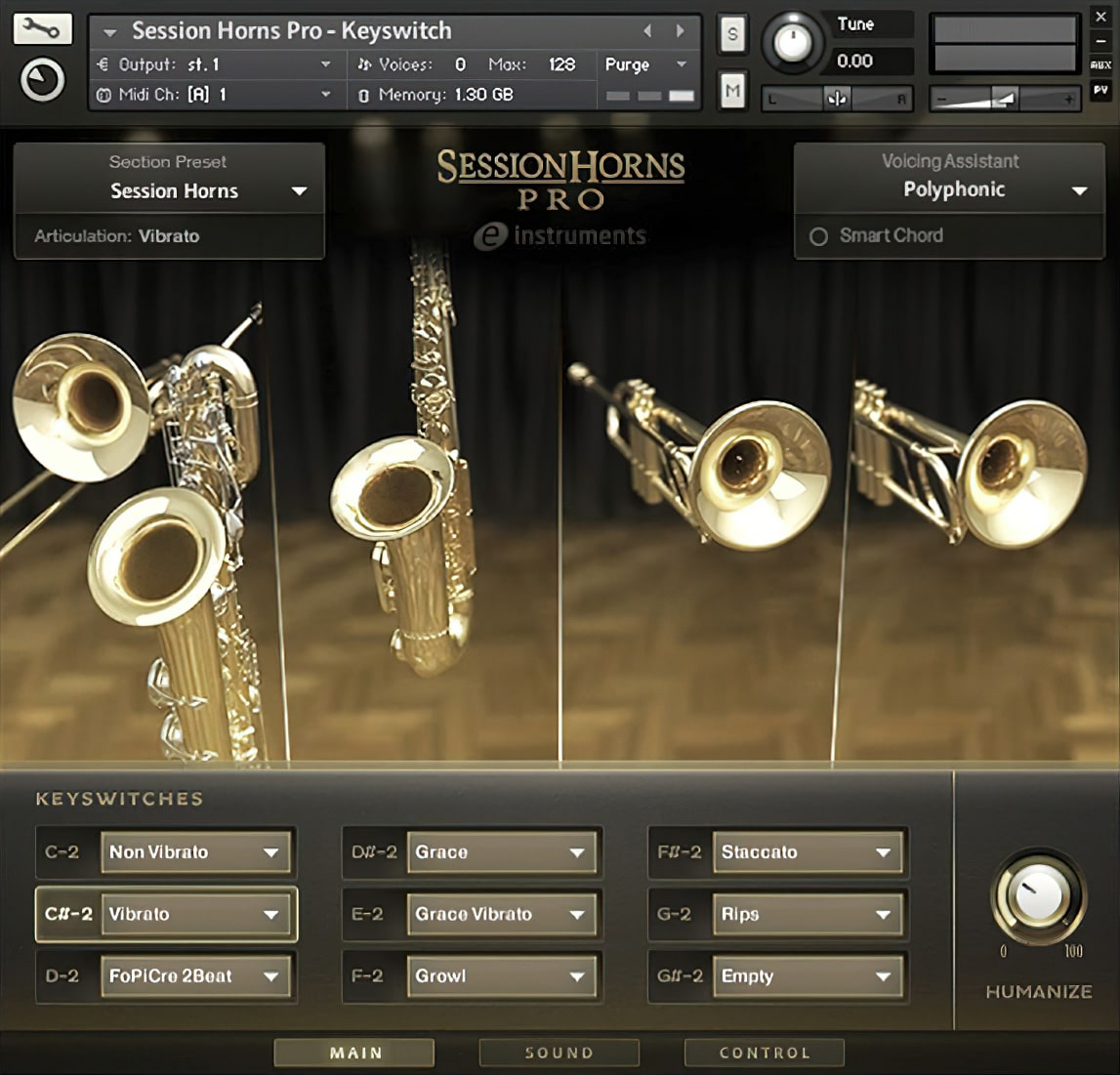 SESSION HORNS PRO oferece três saxofones, dois trombones, três trompetes, tuba e flugelhorn. 38 predefinições de seção pré-organizadas para todos os estilos populares ajudam você a começar da maneira certa. Ou personalize sua seção de sopros com até seis instrumentos divididos em quatro vozes. Você também pode tocar cada solo de instrumento com o máximo de realismo.