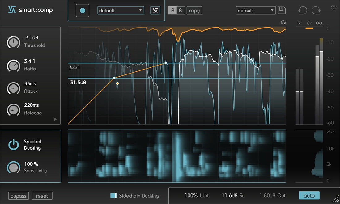 smart: comp acelera significativamente a tarefa de compressão e oferece resultados com maior precisão do que nunca. Com apenas um clique, o plug-in analisa o sinal de áudio de entrada e define parâmetros específicos que resultam em uma compressão bem balanceada - tudo com a aparência familiar e o manuseio de um compressor de banda única.