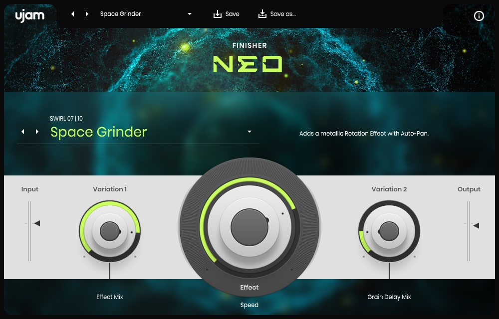 O Finisher NEO vem com 50 configurações de efeitos cuidadosamente projetadas, construídas a partir de 27 algoritmos diferentes - de Grain Pitch a Multiband Distortion, de Delays estéreo simples a Convolução. Três botões macro fornecem controle total sem complicações. Ajuste ou automatize o botão Effect para mudanças sonoras impressionantes musicalmente e ajuste Vari 1-4 para tornar cada efeito seu.